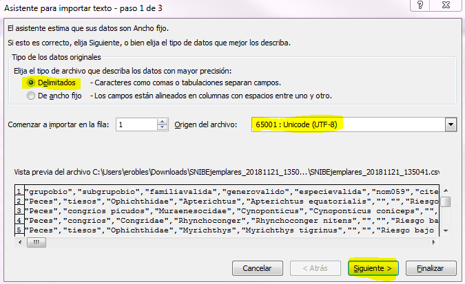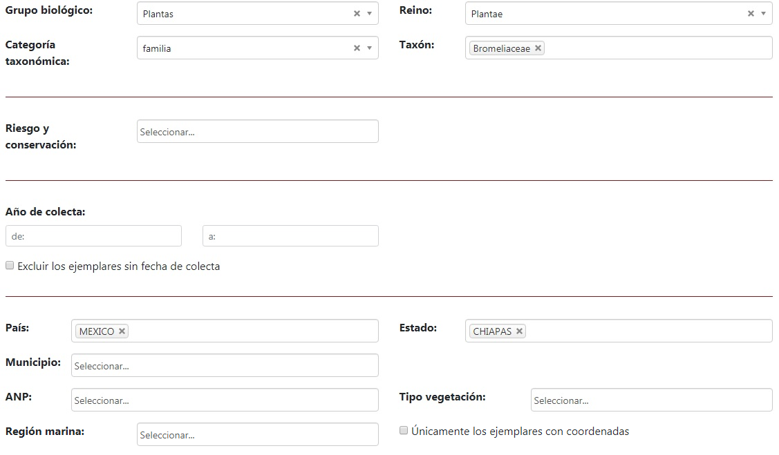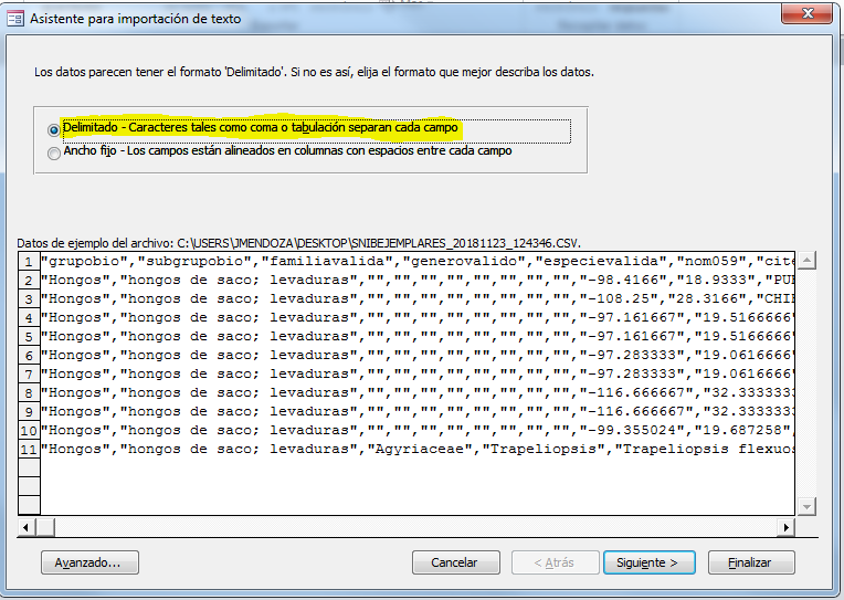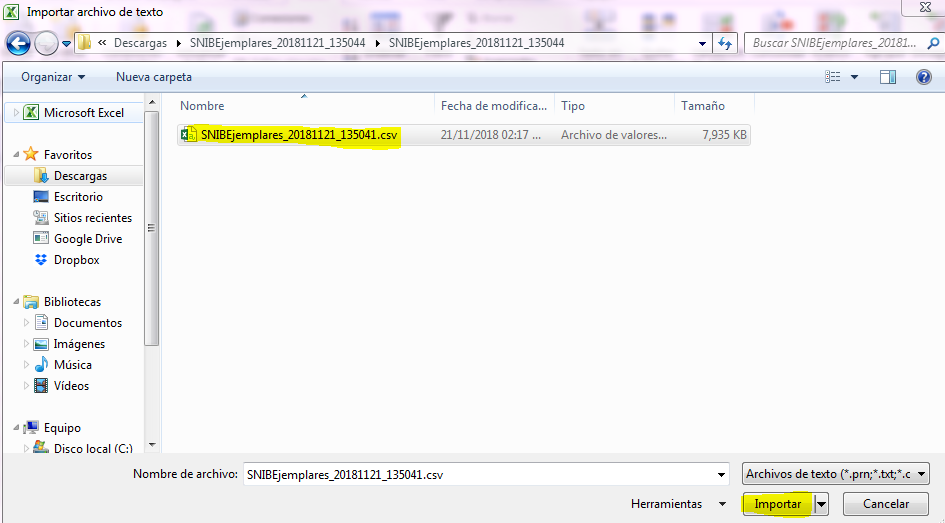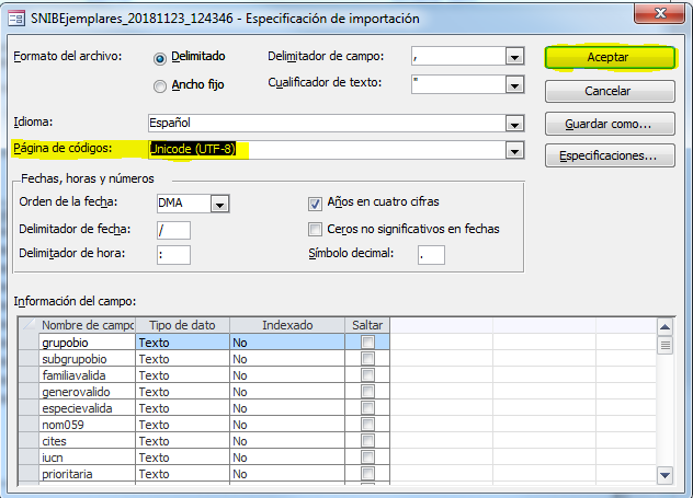 Las descargas de ejemplares y catálogos taxonómicos del SNIB incluyen un archivo en formato CSV (comma-separated values) con las siguientes caracteristicas: