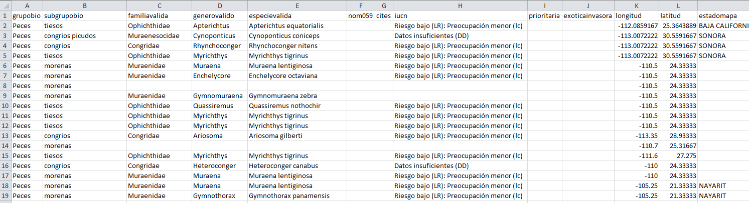 grupobio,subgrupobio,nombrecomun,taxonvalidado,taxonextinto,cites,iucn,nom059,prioritaria,nivelprioridad,exoticainvasora,endemismo,longitud,latitud,paisoriginal,